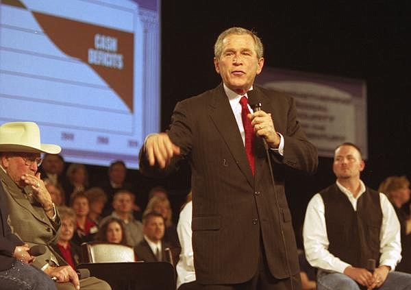 I was trying to get into this little press box not too far from the stage. You see, President George Bush was going to come out from behind that little curtain in the corner in about 20 minutes.