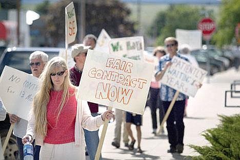 About three dozen teachers from the Polson School District picketed the school administration building Monday afternoon to protest the lack of a contract between the teachers' union and the school district after contract negotiations broke down again last month, the 19th meeting between the two groups in the past year.