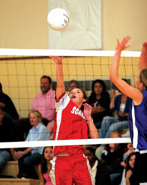 Rayme Bringuel got the Scarlets ahead with a good serve, followed by a killl by Miranda Fox. Jonnell Wieder helped the Scarlets jump out to a 12-6 lead with more good serving, but Mission came back to take a 22-21 lead with three good serves by Kristin McClure.