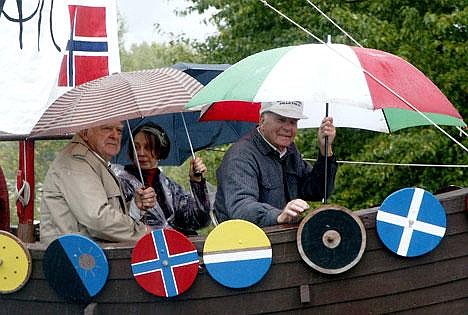Another Wet Nordicfest — Former Nordicfest royalty, Roger and JoElyn Brus from 1996 and Gunnar Larson from 1986, needed coats and umbrellas to stave off the cold rain during Saturday's 21st annual Nordicfest parade. It was the second consecutive year that it rained on the Nordicfest parade.