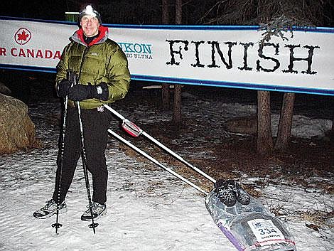 He towed about 25 pounds of survival gear, most importantly a sleeping bag and stove, on a cheap "kids sled" custom-fitted with plastic piping for his harness. A long stretch of the race sent him down the frozen Yukon River, and across chain of iced-over lakes.