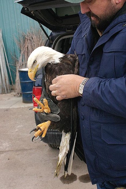 A bald eagle in good health would never have let Dale Becker, tribal wildlife program manager, pick it up, coddle it and show it off to a handful of spectators at the Department of Natural Resources Monday afternoon.