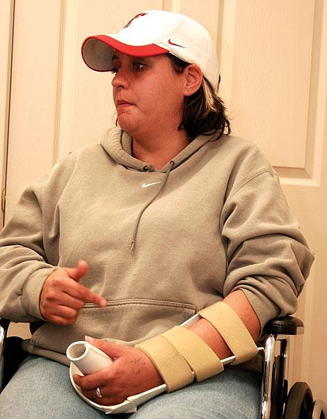 During the month of October, she had anywhere from three to 10 migraines a day, no use in her left hand, with about 50 screws holding her arm together, and was confined to a wheelchair. Two long pins from her knee to her hip hold one leg together, and her left forearm has about a half dozen scars where the bone went through following the crash.