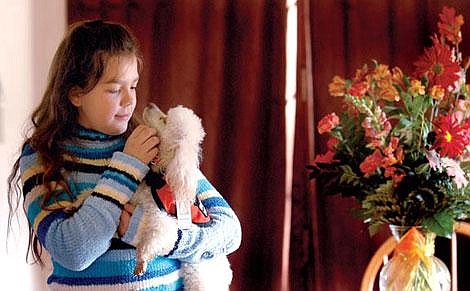 Tinkerbell, a fluffy white toy poodle, raises eyebrows as she prances along in a tiny service-dog vest beside 9-year-old Taylor Diehl.