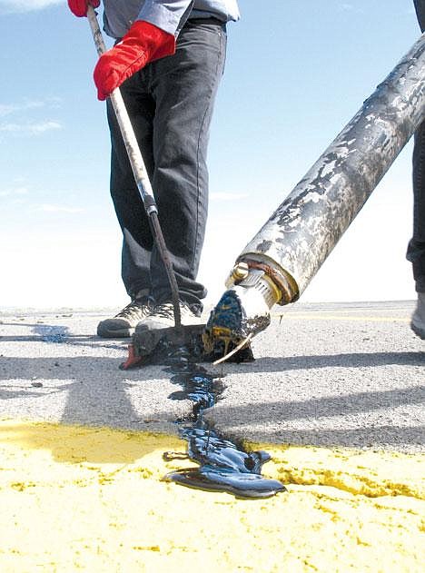 As city officials and port employees looked on, Rick Fulwiler of Spokane-based Arrow Construction Supply demonstrated the machine, filling in cracks on the runway with a hot asphalt-rubber blend substance, which needed to reach 380 to 410 degrees Fahrenheit.