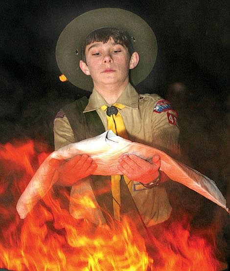 Nearly 40 people, including several Girl Scouts from Troop 485, gathered around the small barrel of fire Friday as the Boy Scouts placed the flags into the flames one by one. People throughout the year dropped off the unserviceable flags, which ranged from slightly worn to severely tattered, to the VFW. The Boy Scouts dissected the 37-foot long Sanders County Fairgrounds flag the day before the ceremony. As Scoutmaster Noah Hathorne told the crowd the meaning of the flag, the Scouts placed the individual stripes, blue canton and stars, and grommets into the fire.