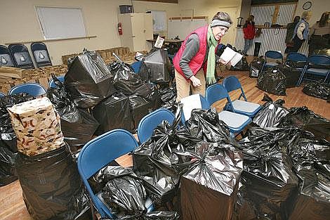 Just over 50 men, women and children showed up at the Thompson Falls Community Center to put the food bags together and get their assignments to deliver the goods, which ranged from the Idaho/Montana border, west of Heron, to Hot Springs and almost to the Lake County border east of Dixon, according to Donna Neal, who coordinates the program each year. The volunteers formed an assembly line and everything was ready to go and loaded in their cars and trucks within an hour.