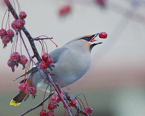 Berries and small fruits are the food of choice for the bohemian. They are ravenous little creatures, and a large flock can strip bushes in minutes. They also frequent trees with leftover apples.
