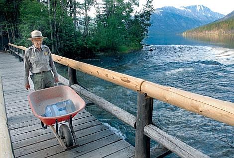 In 2007, Kintla Lake Ranger Lyle Ruterbories uses a wheelbarrow to haul water, propane and food to his cabin along the lakeshore. The tiny cabin he lives in for about five months of the year is a short walk from the campground. (Karen Nichols file photo/Daily Inter Lake)