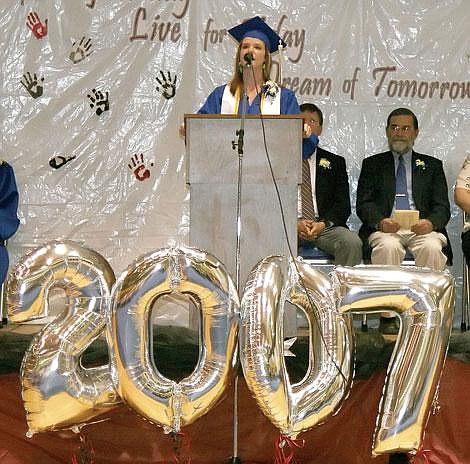 Libby High School Class of 2007 Valedictorian Cassie Roberts addresses the crowd gathered at the Libby High School graduation ceremonies Saturday afternoon.