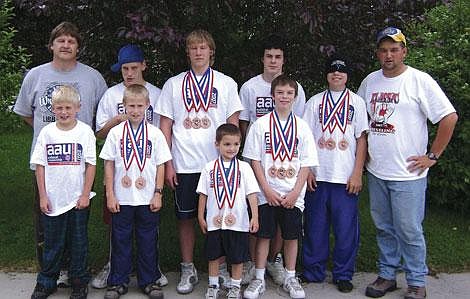 Last weekend, the Libby Wrestling Club competed in the AAU National Championships in Butte. The eight members competing in Greco-Roman, freestyle, and Folk style placed second in the small team division. All wrestlers who placed in the top 8 are "All Americans." Next year, the AAU National Championship will be in Denver, Colo., and the Libby Wrestling Club plans to attend. Pictured in the front row are: Isaiah Sickler ( Midget 70); Zach Crace (Novice 70, 5th place Greco and 6th place in Freestyle); Cody Crace (Tot 45, 8th place Greco and 7th place in Freestyle); Mitch Haugen (Schoolboy 85, 4th place Greco and 6th in both Freestyle and Folk style). In the back row are: Coach Mike Puckett; Jeff Miller (Cadet 125); Lucas Puckett (Cadet 171, 5th place in Greco, 7th place freestyle, and 5th place in folk style); Cody Elliot (Cadet 125); Josh Erickson (Schoolboy 120, 4th place in Greco, 5th place in Freestyle and 7th place in folk style); and Coach Vic Crace. There were over 800 competitors at the 3-day event. Competitors came from as far away as Rhode Island, Maine, Florida, Massachusetts and California.