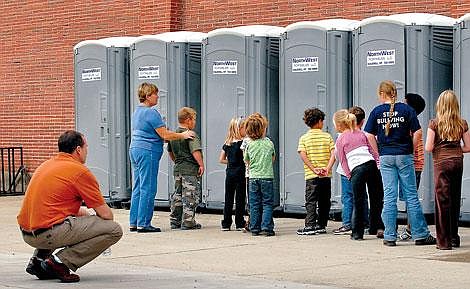 Cases of bottled water lined an inside hallway and a row of portable toilets sat like so many sentries Monday along the outside wall of Elrod Elementary School in Kalispell.
