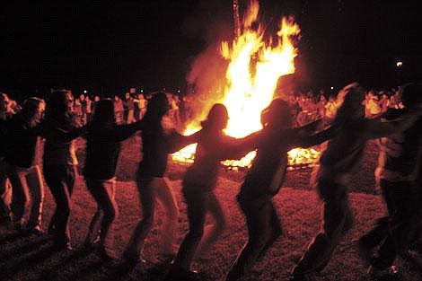 Above, the Whitefish High School students formed a conga-line around the bonfire during the annual Homecoming pep rally. The event Monday night kicked off Homecoming week, which ends with a football game against Ronan on Friday night, followed by a dance. All the Bulldog sports teams gave speeches and performed cheers. Left, Daniel Gibb plays the electric bass for the Whitefish High School pep band during the rally. “I have to play way back here because I’m the only one that has to be plugged in,” he said.