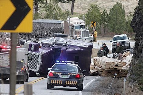At approximately 2:30 p.m., Maurice Turner, a resident of Columbia Falls, was driving east on Highway 200, when his load of timber shifted while he was rounding a corner about six and a half miles east of Paradise near mile marker 89, flipping the semitrailer on its side and sending it sliding about 50 feet, according to Montana Highway Patrolman Keith Danhof.
