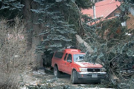 Don Schwennesen, a Bigfork realtor, had his camper smashed by a falling tree at his home in Yellow Bay. His pickup was also damaged by a fallen tree.