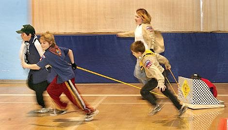 Fifty-one Cub Scouts from three Lake County teams and one Sanders County team participated in the racing event, held at Mission High School in St. Ignatius Saturday afternoon. The competition, which ran nearly two hours, included just over a dozen races — double elimination — for the Tigers, Bears, Wolves, and Webelos Scouts from Plains, Polson, Ronan, and St. Ignatius, including some Charlo boys who belong to the Ronan pack. Each pack designed its own chariot, which was made of cardboard with a towel duct taped to the bottom to help it slide better, and four nylon ropes with a board on one end and wooden handles on the other. The chariots were custom decorated by the Scouts with drawings and stickers, and for the most part, the pack number.