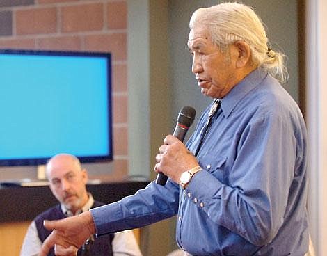 Pat Pierre, a Pen d'Oreille and Kootenai elder, closed the meeting by telling a story about his grandmother, who bathed and washed herself in a river on someone else's land. When a new, white owner took over, he told Pierre's grandmother she had to leave. His grandmother said her people had been using the river for generations, but the new owner continued to ask her to leave. At last, declaring that the water was hers, Pierre's grandmother took one of the towels she had been washing and chased the new landowner around, hitting him with it.