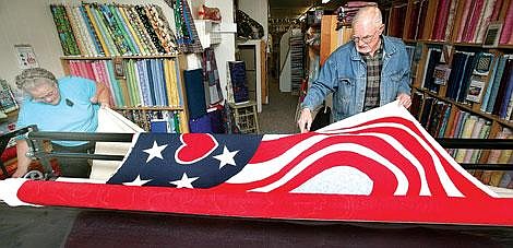 Pies started on the quilt about a month ago and did most of the work on his own sewing machine at home. Some of the work was done by hand by him and his wife, Barbara, who also helped him complete the binding, which will have to be done by hand, too. Barbara Farrington of The Quilting House in Thompson Falls also helped him with the quilt on the store's long arm quilting machine last Wednesday. Farrington said a group of Thompson Falls residents have made quilts for the soldiers.