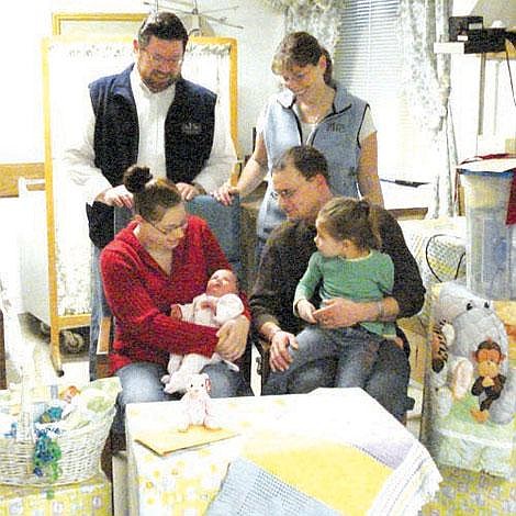 The New Year's baby is celebrated throughout the community. Along with St. John's Hospital employees and Auxiliary members, who provided the new parents with a child car seat, a baby quilt, beanie babies, an afghan handmade by a hospital employee, and a case of diapers — other area businesses and individuals joined in and provided gifts for the new family. Pamida generously donated a stroller, Glacier and First National banks provided $100 savings bonds, Libby Clinic put together a diaper pail full of baby gifts including a baby monitor, and the Community Health Center donated a baby basket filled with newborn accessories.