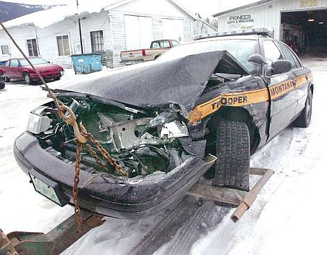 A Libby Montana Highway Patrol trooper was injured on Monday in a two-vehicle crash involving a semi tractor-trailer.