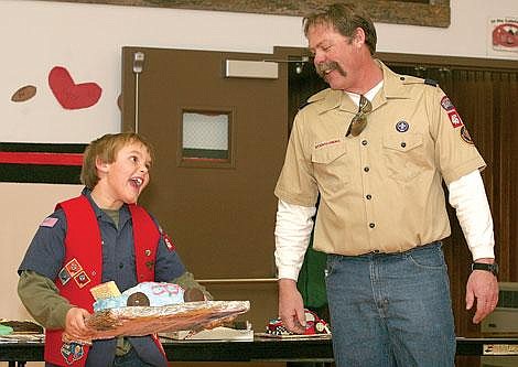 Twelve Scouts participated in this year's event, which was a combination cake contest and auction at the Plains School cafeteria Thursday evening. The pack raised $241 with their dozen cakes. In an effort to help the parents get their own cakes back, the maximum bid was set at $20 — although Don Damschen went a dollar more for Douglas Damschen's "Herbie Love Bug" car rendition.