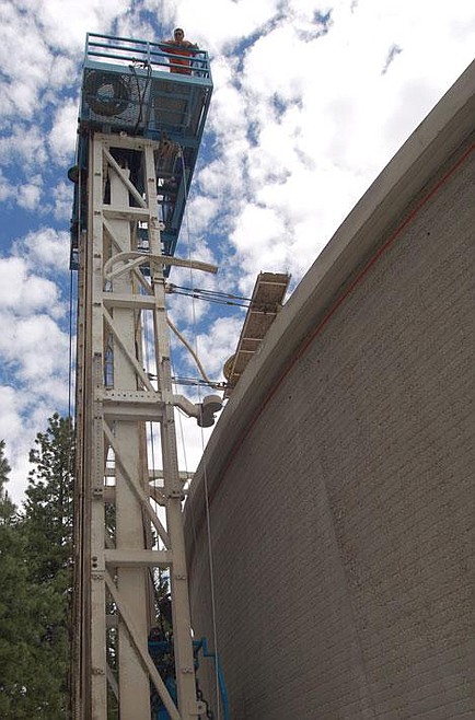 Prestressing involves wrapping 3/8-inch-thick, seven-strand galvanized steel wire around the entire tank from bottom to top, and covering it with a 1 1/2-inch layer of "shotcrete" - a concrete mix sprayed with a hose.
