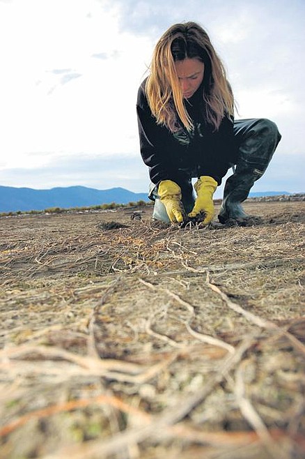 Representatives from ISDA, the corps and the soil district worked plots at the Clark Fork Driftyard on Thursday. The volunteers plunged their hands into the mud and meticulously extracted rhizomes and root pieces so they could be piled up and hauled away.