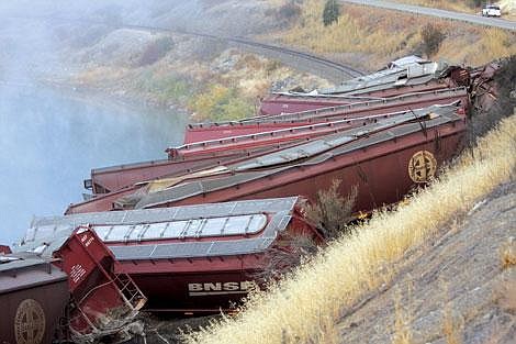 PLAINS - Nineteen cars of a 111-car Montana Rail Link train derailed just west of Plains early Wednesday, spilling about 37 tons of soybeans into the Clark Fork River.