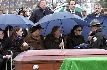 Gov. Brian Schweitzer, Department of Transportation Director Jim Lynch and Montana Attorney General Steve Bullock stood behind members of the fallen trooper's family as mourners placed red roses on Haynes' casket.