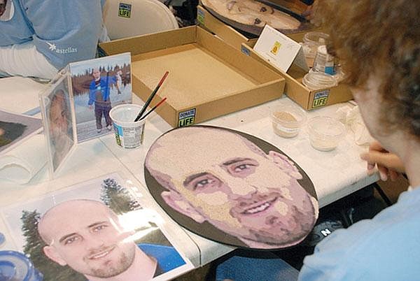 Supplied with a paint-by-number style portrait of their son, glue and a tray of diverse “paints” – poppy seeds, coffee grounds, crushed wheat – Paul and Carol Parsons and their two daughters created Bronson Parsons’ smiling face using organic materials.