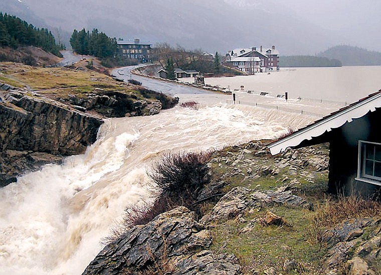 In the Many Glacier Valley, Swiftcurrent Lake rose to a level where its outlet was overwhelmed and water was crossing over the only road to Many Glacier Hotel. The lower floor of the hotel was flooded with about six inches of water at one point.