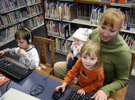With storytelling at an end for her daughter's age group, Jodie Newsom moved into the children's area for another one of the youngster's favorite activities - playing learning games on the library computers.