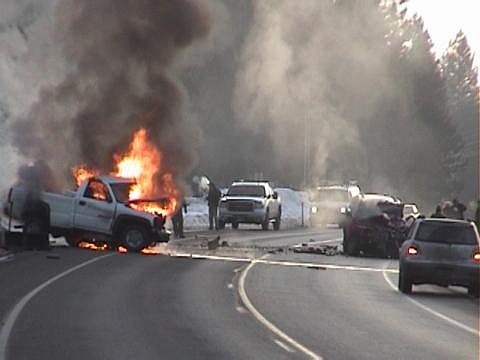 Following the crash, Hanson’s vehicle caught fire, sending flames shooting into the air. The accident blocked traffic on Highway 2 and closed the highway for about 3 1/2 hours.