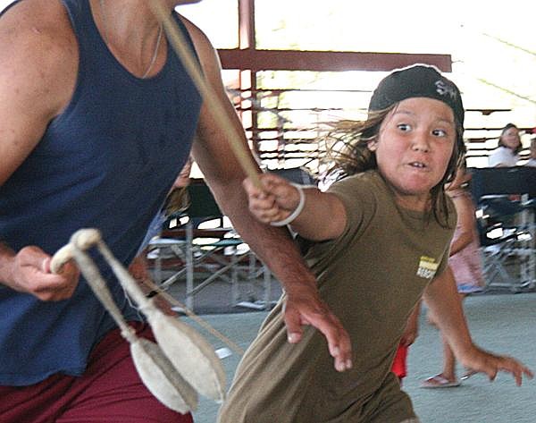 ARLEE — Amidst a swarm of kids of all ages steeped in an intense game of “double-ball” at the Arlee Powwow, Paul Phillips emerges victorious with the leather pouched prized object draped over his stick as he sprints the arena baseline with a dozen young competitors in pursuit.