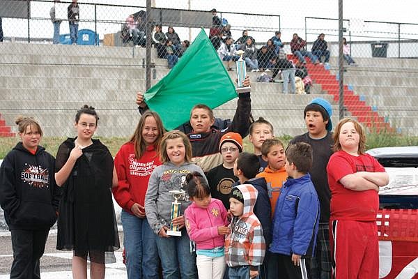 Fourteen-year-old Pablo speedster Brandon Drake’s car splits the difference in a race when drivers Timmy Rodgers, left, and Kelly Dupuis spin out. The race started over, and again Drake came out ahead. Right, Drake celebrates his first place win in the Bomber 4 division at Mission Valley Speedway in Pablo after the race. When asked how it felt to win his second gold in a row in his first season of racing, Drake had this to say: “It feels good. It feels like I’m the underdog.”