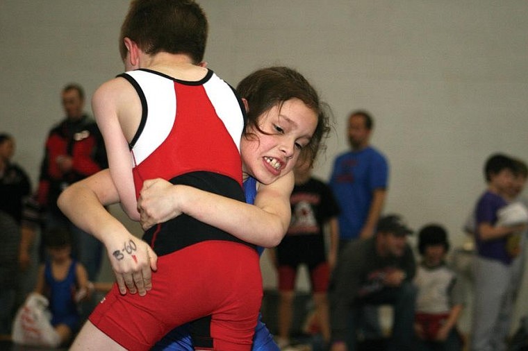 Polson Middle School was the venue, and beginner and novice wrestlers from across the valley and beyond were the show this past Saturday. Polson, Ronan and Mission-Charlo wrestlers from five years old to fifth grade faced off against each other and teams from Superior, Frenchtown and Missoula. Pictured are: Polson Pirate Kedrick BakerBrown, top, gets the better of Frenchtown wrestler Carson Pyron. Mission-Charlo Irondog Wacey McClure, right, throws down Missoula wrestler Michael Deschane. Ronan Chief Ethan Yarck, right, gets a couple hands in the face from a Frenchtown wrestler. All were in the beginner age group and each wrestler got in a few matches at the jamboree.