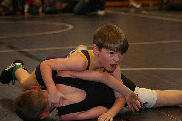 PHOTO: Polson wrestler Trey Kelley, top, out-muscles a Frenchtown wrestler last Saturday during a beginner group match at the Unit Four Little Guy Wrestling Tournament. Polson, Ronan, Mission-Charlo and Arlee all placed wrestlers in the top four for the beginner, novice, middle and junior classes. The top placers will compete next week in Ronan. The top placers from there will compete at the Western Montana Championship tourney in Columbia Falls the following week.
