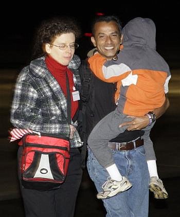 After they disembarked the charter flight from Kenya, one crewman, carrying a child toward the terminal, shouted, "I'm happy to see my family."