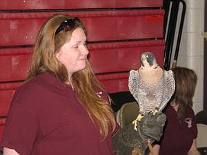 The group takes care of raptors that can’t survive in the wild. At the booth, Angela Burns holds a peregrine falcon named Piper.