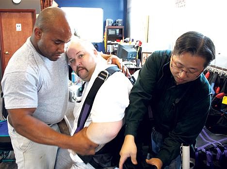 Tham, a chiropractic doctor, was working alongside the firm’s fitness director, certified personal trainer Tyronne Larson, to lay out a matrix of harnesses that would crisscross Jeffrey’s torso and prepare him to be lifted into a standing position for his therapy session.