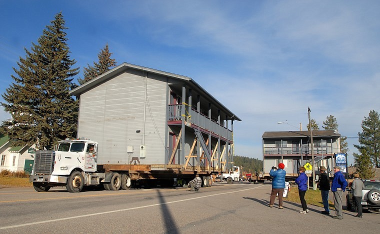 Two buildings from the Bayshore Motel move down U.S. 93 in Lakeside on Thursday morning. The buildings were being moved to the Youth With A Mission area. The motel property was bought by Margaret Davis and Bruce Ennis to make room for a public park to be developed by the two before turning it over to Flathead County.