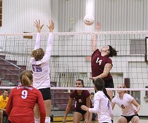 Moses Lake junior Kayla Bernsen led a sharp offensive attack at the net, sparking an 8-3 rally as the Chiefs pulled even at 20-20. Bernsen led the Chiefs during their rally, scoring four points off of kills and another after blocking an Eastmont kill attempt.