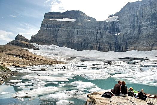 Then, it happened. After making the final climb up the rocky pathway to the crest of the glacial moraine, the full scope of Grinnell Glacier lay before me — a lake filled with icebergs, from one side to the other, over which hung three major glaciers and a few snow fields that sloped down from the continental divide, in the glacier cirque between Mt. Grinnell and Mt. Gould.