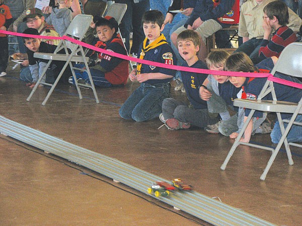 Cub Scouts, from left, Davien Adams, Matthew Druffel, Davis Smith, Daniel Leas and Kieanuneau Brown, watch the Pinewood Derby cars go racing by at the Silvertip District Pinewood Derby in Plains on March 27. Druffel, of St. Ignatius, was the first place winner at the event. The state competition will be held May 1 in Billings.