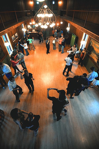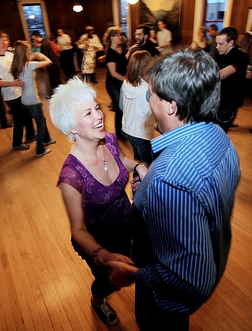 On this April evening a crowd of about 60 people has gathered to learn the basics of East Coast swing and then to enjoy a bit of social dancing. Pete Milne, 23, and Joe Juneman, 24, both of Kalispell, go over some of the basic rules of social dancing and the basic steps of swing. The two friends have been dancing for four years, but only got into swing dancing in February of last year.