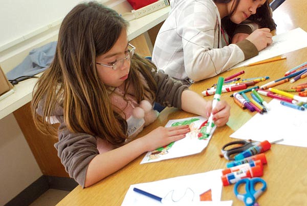 As kindergartner Austin Baldwin worked on his art project, Arlee senior Jesse Pfau entertained him with jokes.