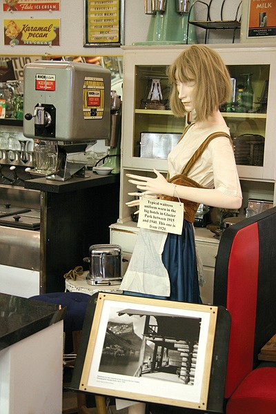 Inside, pictures and souvenirs cover every wall. The waitress behind the restaurant counter is wearing a uniform from 1920 that was worn by waitresses at hotels in the park from 1915 to 1940. A photo in front of the waitress, part of the traveling exhibit donated by the Montana Historical Society, shows a woman wearing the uniform in the park in the 1930s. The late Doris Huffine donated the uniform displayed in the MOAM, Joanne said.