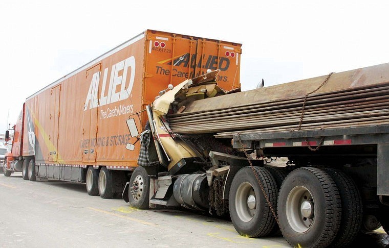 The male driver of the flatbed truck was killed, crushed between the two trucks, and the driver and passenger of the orange semi were taken to St. Joseph Hospital in Polson with minor injuries, according to law enforcement officers.