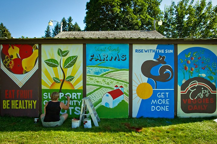 What Annie did last week was donate her artistic talents to it while vacationing here. Over three days she painted a mural on the side of a nearby building of five WPA-styled, Depression-era posters, promoting the positive side of healthy living.