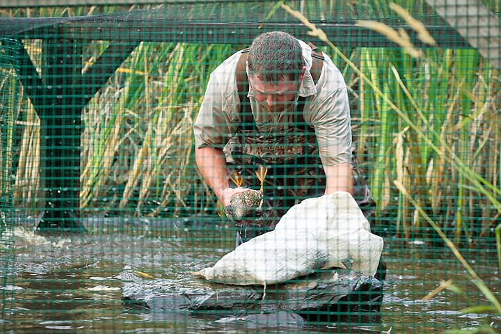 He tries to reduce that fear by slipping the bib of his hip waders over the duck's head, which he said calms them.